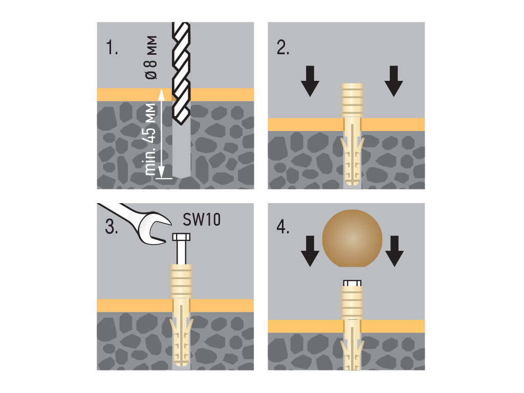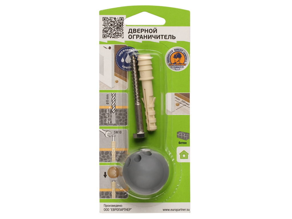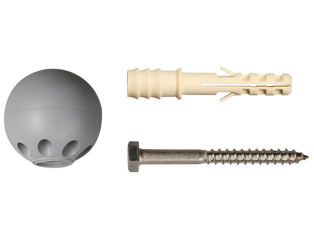 Комплект состоит из нейлонового дюбеля, установочного нержавеющего шурупа и декоративного сферического ограничителя.