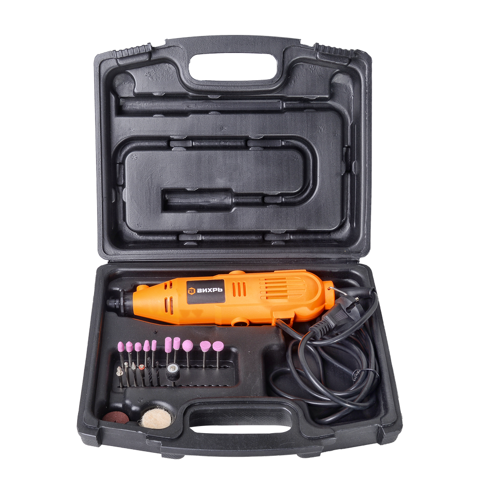Электрические граверы ВИХРЬ Г-150 являются универсальным электрическим инструментом, который позволяет выполнять множество видов работ, часть из которых - шлифование, сверление, фрезерование, гравировка. Гравером отлично можно снять ржавчину, краску и заусенцы после сварки. Изделия из металла легко поддаются полировке гравером. Также гравер можно использовать в роли болгарки – пилить тонкие металлы, медные трубы и оргстекло. Декупаж, нанесение рисунков и надписей также подвластны граверу. Работает по принципу дрели с регулируемым количеством оборотов. Цанговый патрон в который зажимается необходимая насадка вращается благодаря электродвигателю с пластиковой крыльчаткой охлаждения. Расходные материалы: всевозможные фрезы и шлифовальные элементы.