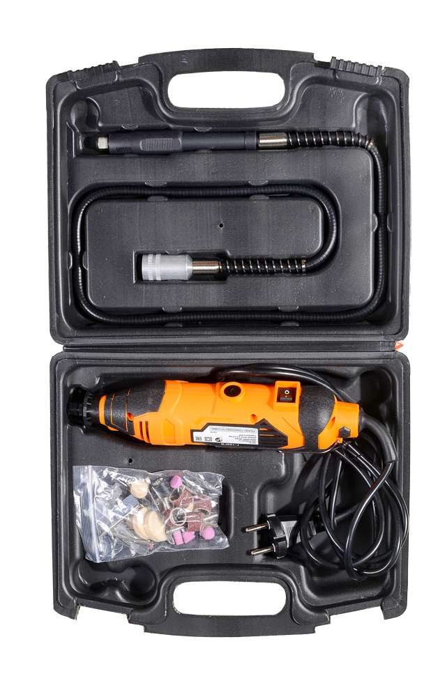 - Гибкий вал позволяет более комфортно работать с мелкими деталями, есть стойка для удобного хранения;