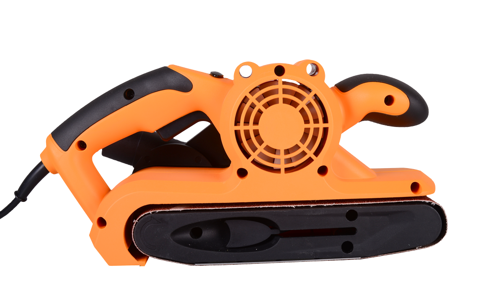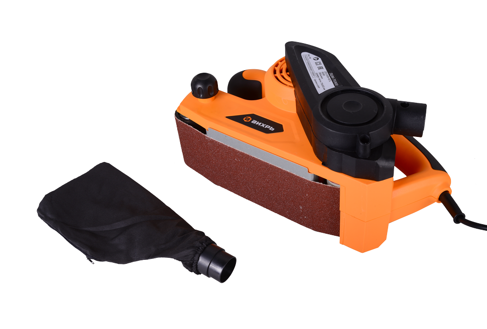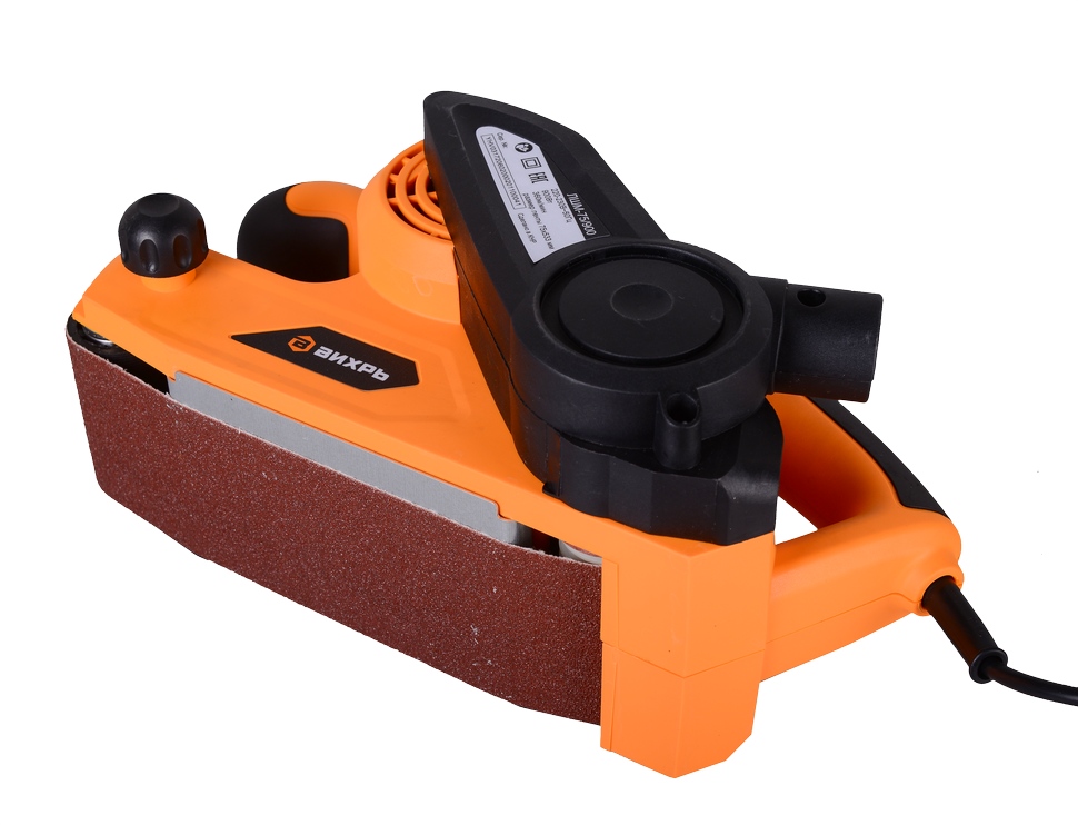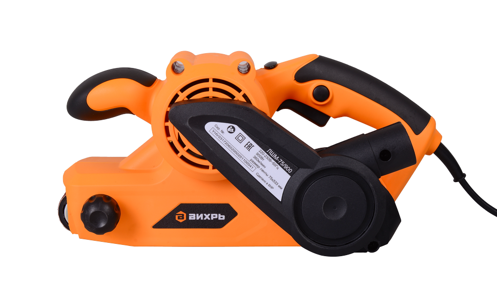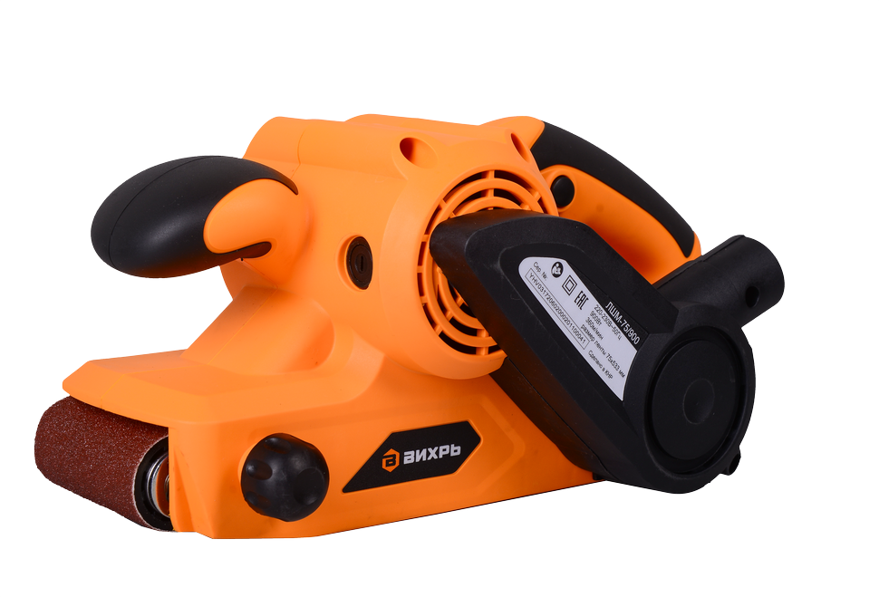 Ленточная шлифовальная машина ВИХРЬ ЛШМ-75/900 относится к классу инструмента с электрическим двигателем. Она состоит из корпуса, в основании которого находятся два ролика. На них надевается замкнутая лента с абразивной поверхностью. Один из роликов ведущий, второй служит для регулировки поперечного положения ленты. За счёт вращения ленты на большой скорости и движения инструмента по заготовке происходит снятие верхнего слоя материала.